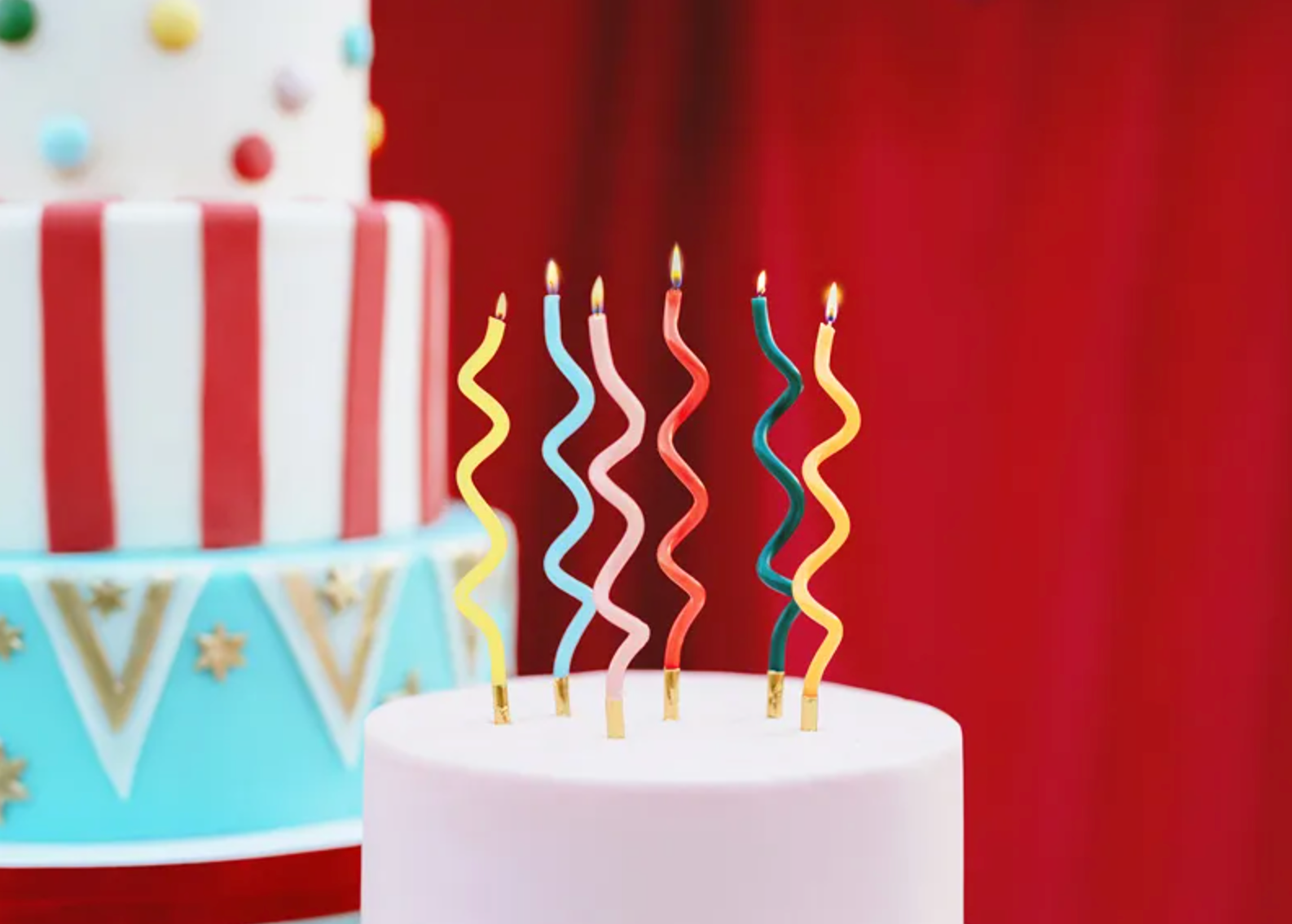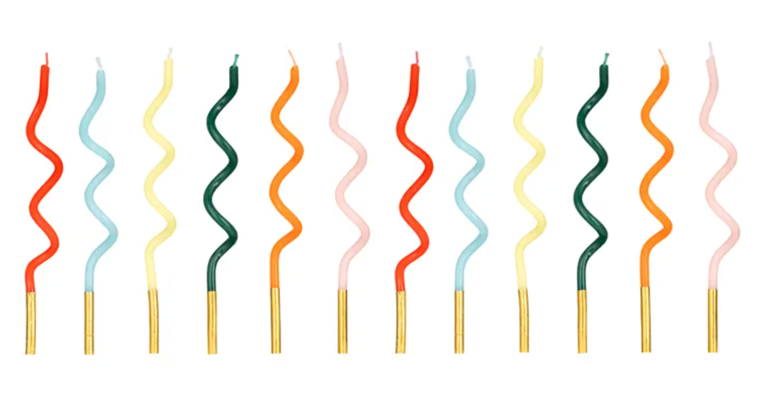 Rainbow twisted birthday candles, assorted colors (yellow, pink, blue, red, green, orange), height approx. 14 cm. Set contains 12 candles.... Read more