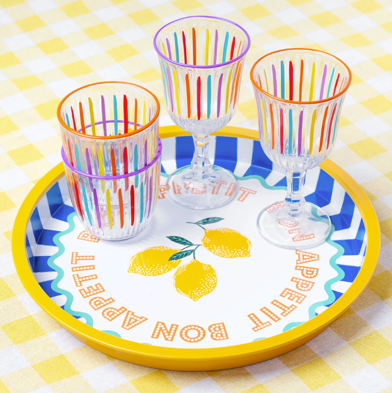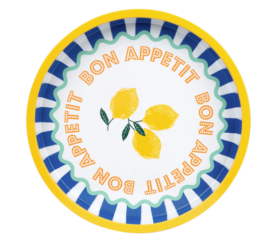 Bring the spirit of a Mediterranean vacation right into your home with this Bon Appétit tray. Adorned with blue seaside piping and a lemon motif with circular lettering, it evokes carefree days on the French Riviera—without the need to board a plane. Perfect for serving drinks, snacks, or as a decorative accent in the kitchen or dining room.