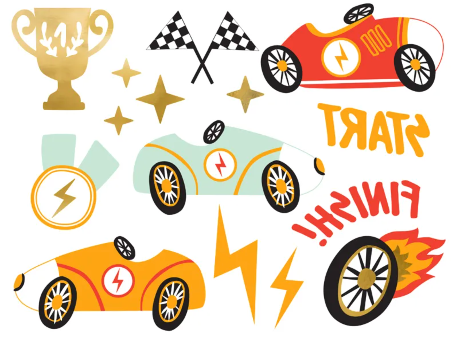Cars temporary tattoos, mix of patterns and colors, set contains 11 different designs. (1 pack / 11 pieces)