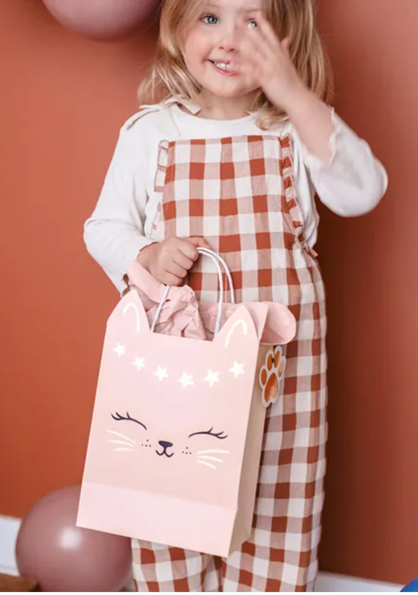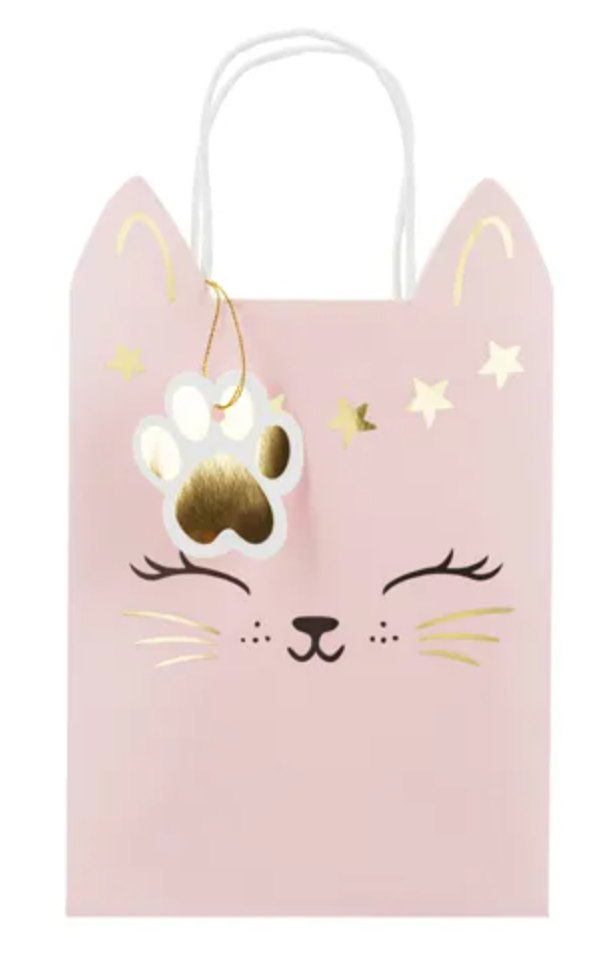 Pink gift bag with a print and a pendant in the shape of a cat's paw and a print, dimensions without handles approx. 18 x 10.5 x 27.5 cm.