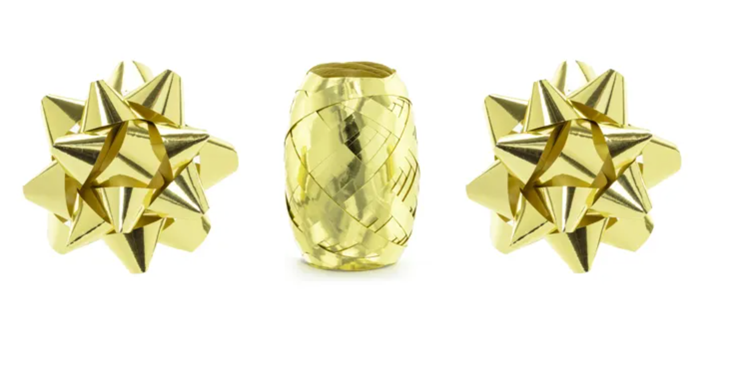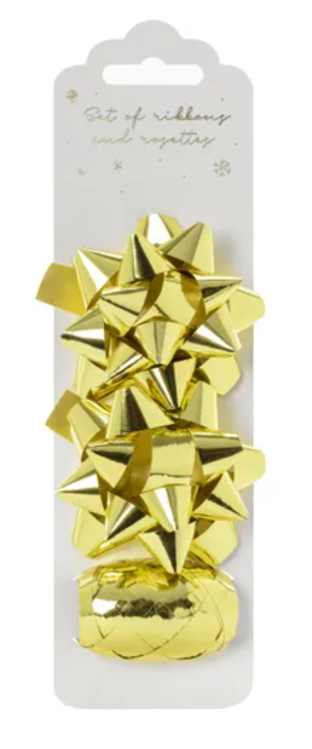 Ribbon and 2 gold-colored metalized plastic rosettes. Ribbon dimensions: width approx. 5 mm, length approx. 10 m, rosette diameter approx. 7 cm. (1 package / 3 pieces)