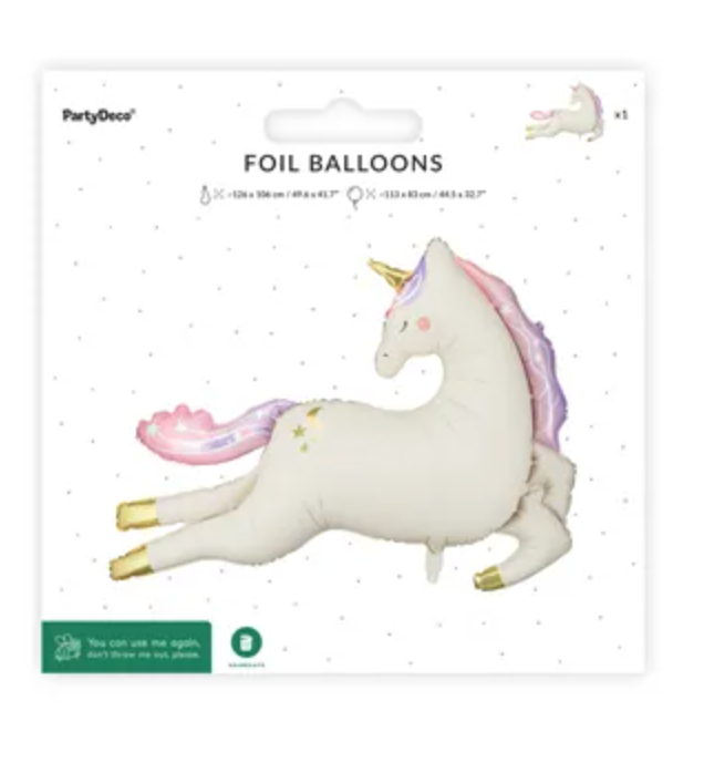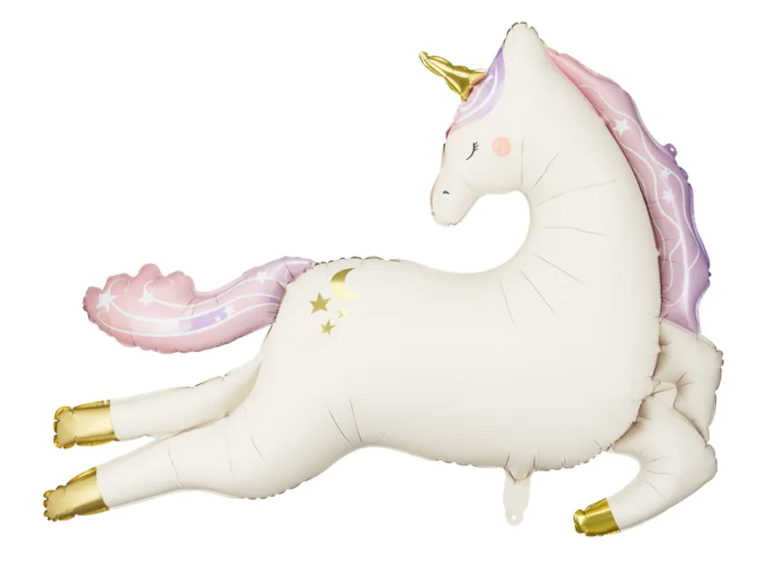 Balon foliowy matowy Jednorożec w kolorze beżowym ze złotymi i tęczowymi elementami. Wymiary przed napompowaniem ok. 126 x 106 cm... Czytaj więcej