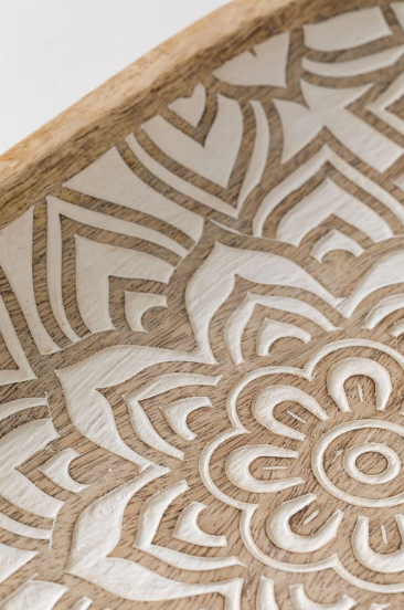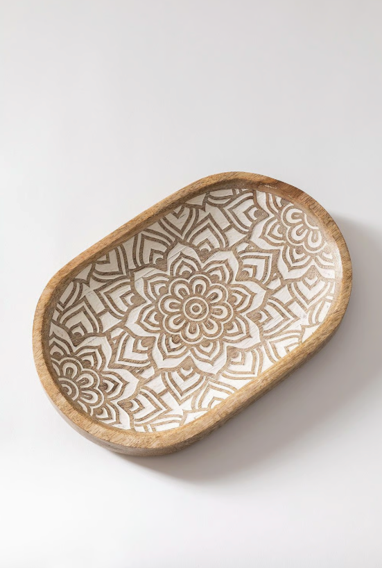 Dzięki dekoracyjnej tacy Breda z drewna mango będziesz mógł odtworzyć egzotyczne, zaskakujące i magiczne otoczenie . Produkcja drewna mango zapewnia mu bardzo solidną konstrukcję. Jego konstrukcja ma owalny kształt z misternymi rzeźbieniami . Breda oferuje nieograniczone możliwości, możesz stworzyć piękną dekorację centralną, łącząc ją z suszonymi kwiatami i świecami, wykorzystać ją jako opróżniacz kieszeni w przedpokoju lub do przechowywania biżuterii.