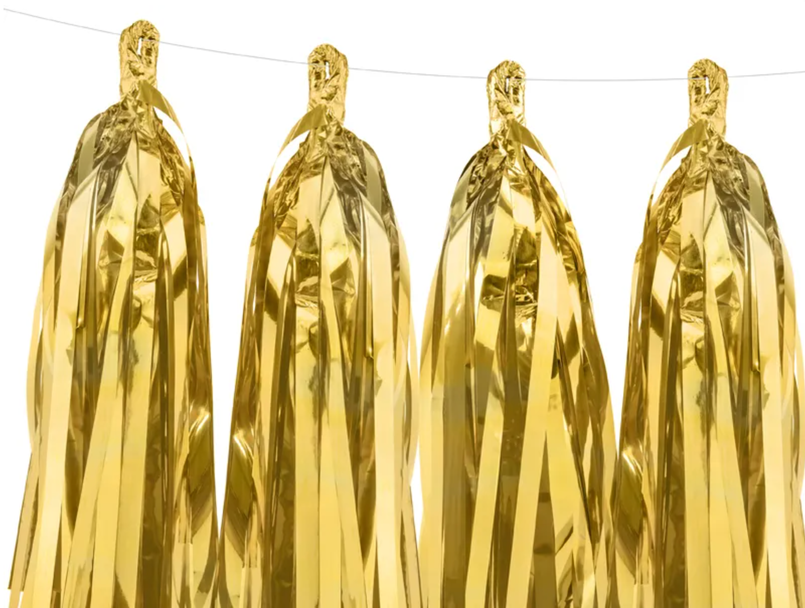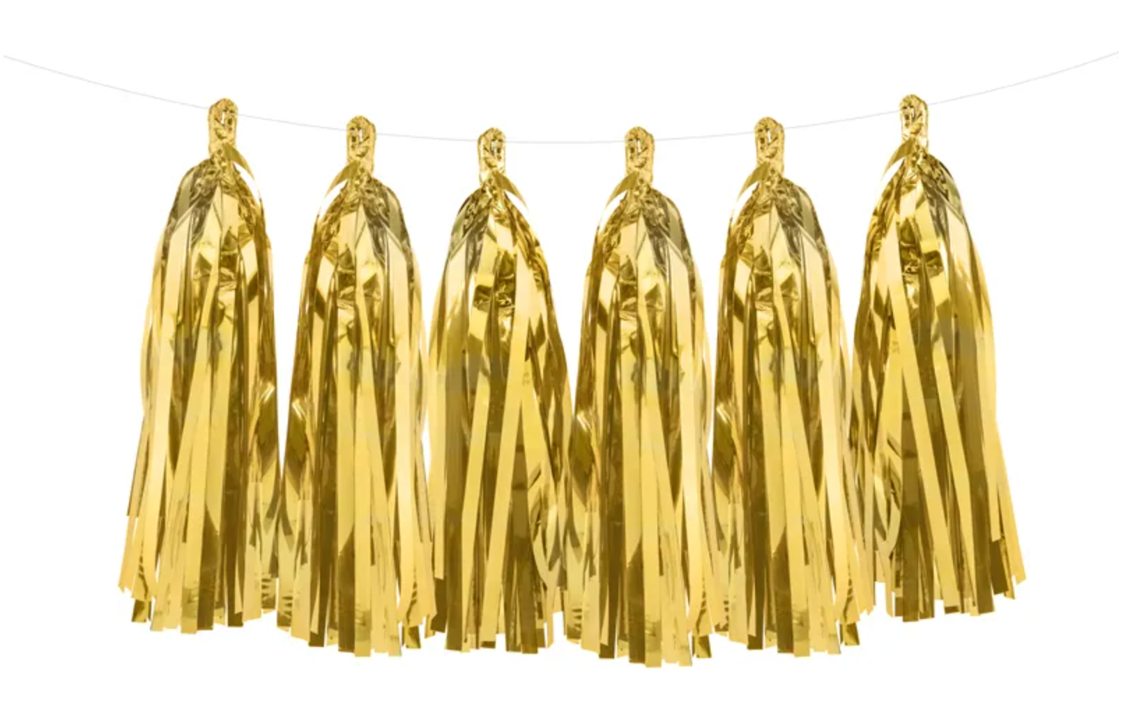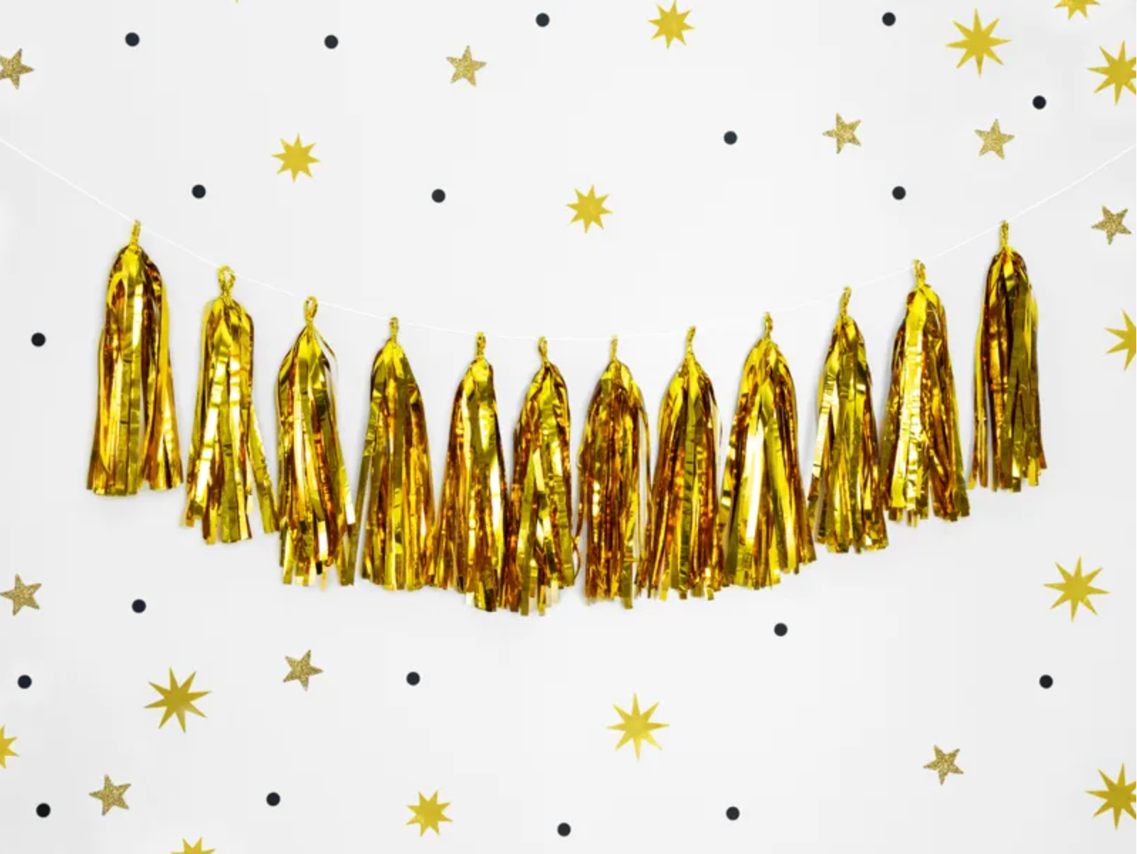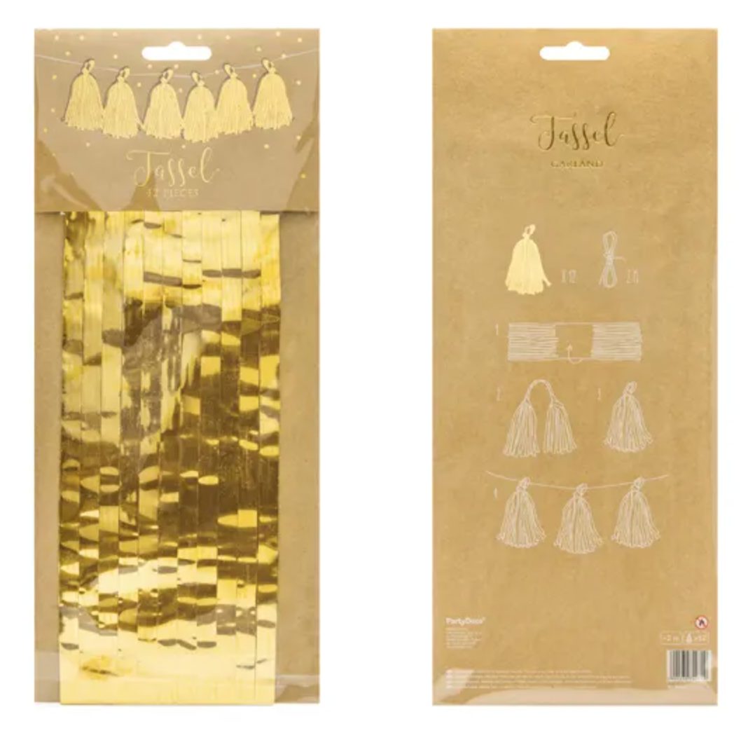 Girlanda frędzle, do samodzielnego złożenia, zestaw zawiera 12 frędzli w kolorze złotym lustrzanym i ok. 2 m białego sznurka, wymiary... Czytaj więcej