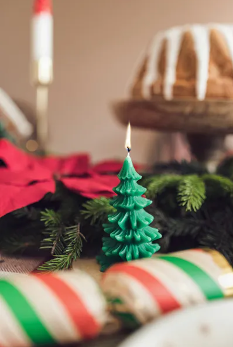 Świeca Choinka w kolorze ciemnozielonym, wysokość ok. 10 cm. Czas palenia: 5 godzin.