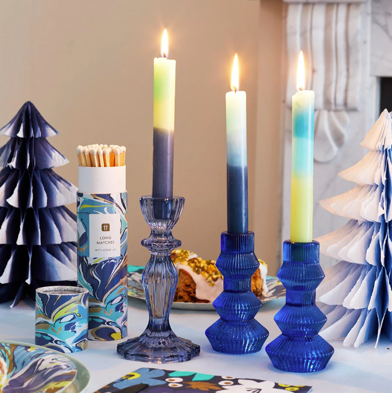 Ten piękny granatowy świecznik doda Twojemu wnętrzu odrobiny wyrafinowania i stylu. To elegancki akcent, który doskonale uzupełni kolekcję dekoracji stołowych i dodatków do domu. Szklany świecznik prezentuje się wyjątkowo sam w sobie, ale w połączeniu z innymi świecznikami w różnych kolorach lub z wazonikami na pojedyncze kwiaty stworzy efektowną kompozycję — idealną jako centralna ozdoba stołu.