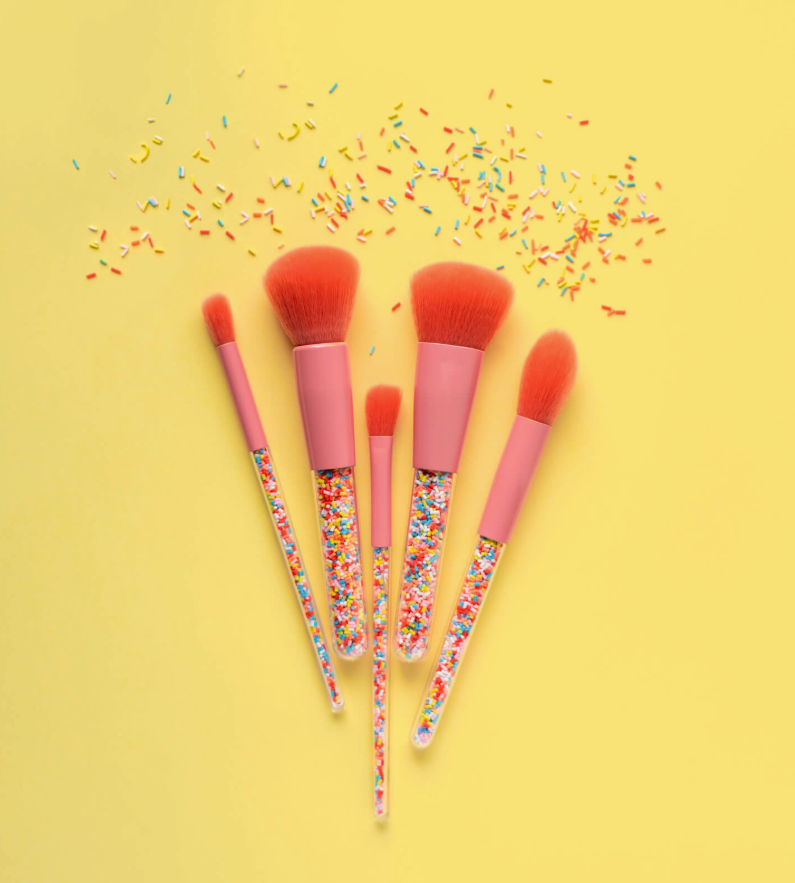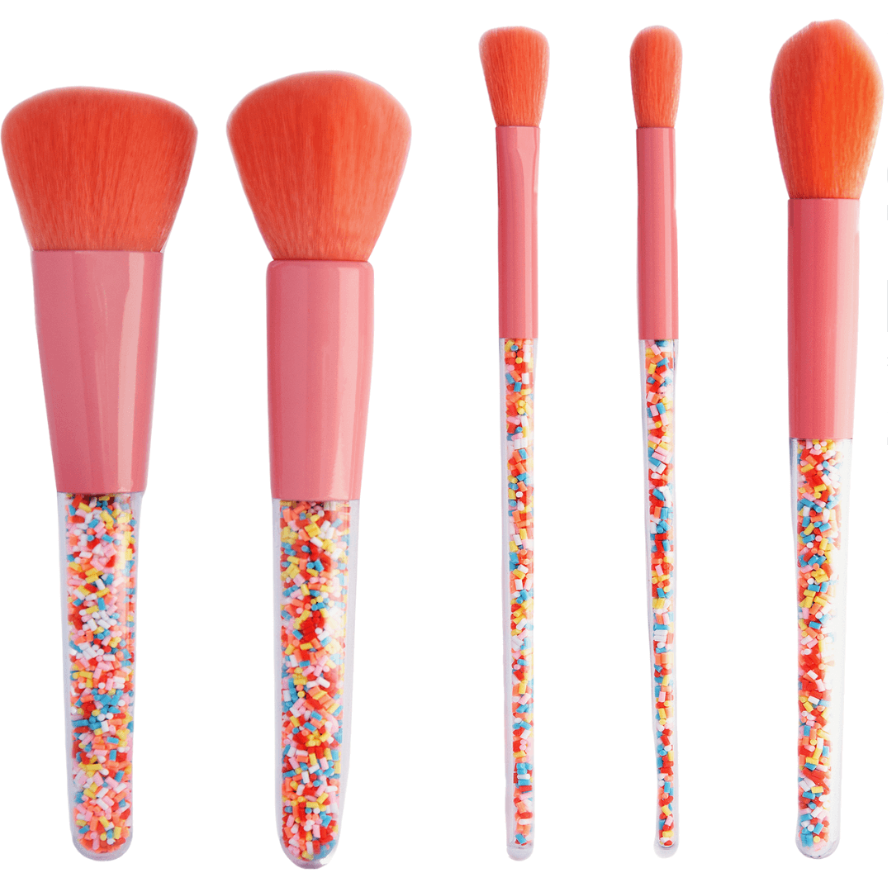Zestaw zawiera pięć delikatnych pędzelków dla dzieci, które są hipoalergiczne, wegańskie i nigdy nie testowane na zwierzętach. Delikatnie zakończone włókna nie podrażniają wrażliwej skóry dzieci. Każdy pędzelek posiada efektowne uchwyty imitujące słodką posypkę – z pewnością wywołają uśmiech na twarzy Twojego malucha podczas zabawy! Pędzle zapakowane są w przezroczystą zapinaną kosmetyczkę.